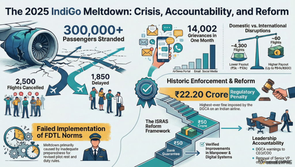 With IndiGo commanding nearly 65% of India’s domestic market, any disruption in its operations becomes a national mobility crisis. The episode therefore offers invaluable lessons for UPSC themes such as regulatory mechanisms, corporate governance, consumer protection, infrastructure management, and public policy design.