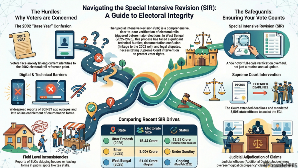 The recent intervention of the Supreme Court of India in the Special Intensive Revision (SIR) of electoral rolls in West Bengal (2026) marks a defining moment. The Court flagged a “trust deficit” between the Election Commission of India (ECI) and the State government and ordered deployment of serving and retired district judges to oversee claims and objections in voter list revisions.