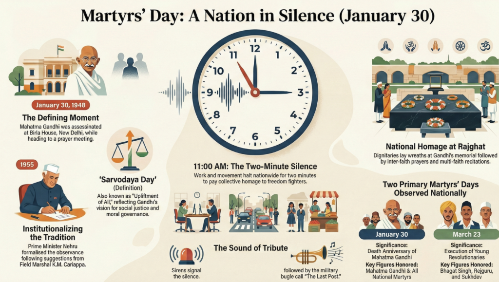 The observance commemorates the assassination of Mahatma Gandhi in 1948, while simultaneously honouring all freedom fighters who laid down their lives for India’s sovereignty. In recent years, institutions such as the Supreme Court of India have reinforced this ethos by halting proceedings and observing a two-minute silence at 11:00 AM, aligning judicial practice with nationwide homage.