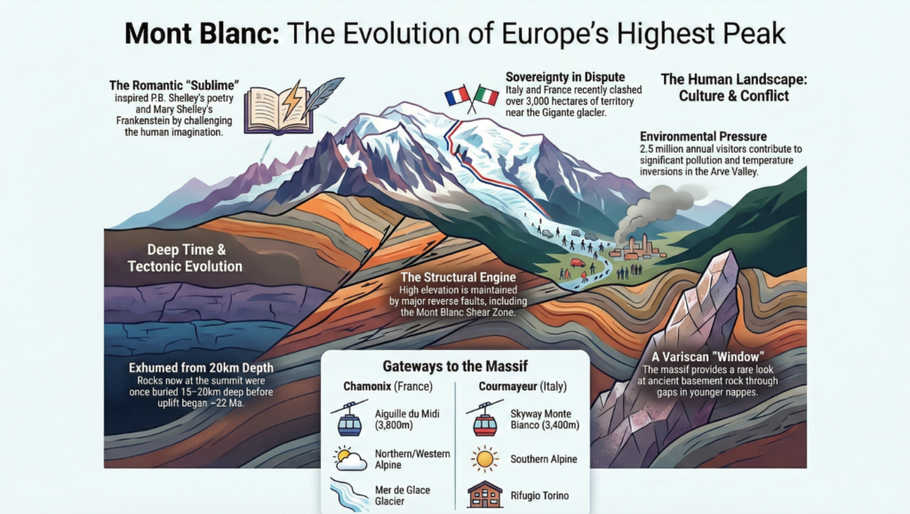 Mont Blanc (≈ 4,805–4,810 m) is the highest peak of the Alps and Western Europe, located on the France–Italy border within the Mont Blanc Massif. More than a summit, it is a meeting point of tectonic forces, glacial processes and human imagination. The massif forms a natural barrier between Chamonix (France) and Courmayeur (Italy), historically creating distinct cultural landscapes. For UPSC geography, Mount Blanc is a classic example of: