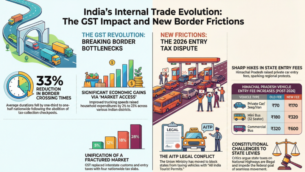 GST replaced origin-based taxation with a destination-based consumption model, eliminating the fiscal need to stop goods at state borders.
