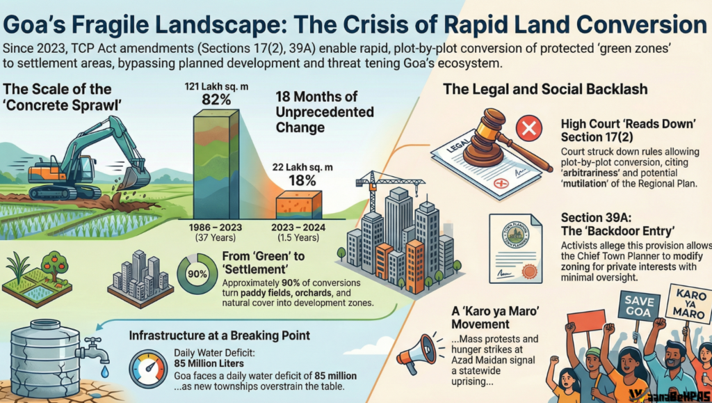 Recent protests over amendments to the Town and Country Planning (TCP) framework—particularly Section 39A—have triggered intense political and legal debate in Goa. At the heart of the controversy lies a deeper structural issue: the tension between rapid land conversion for real estate development and the sustainability of public infrastructure and fragile ecosystems.